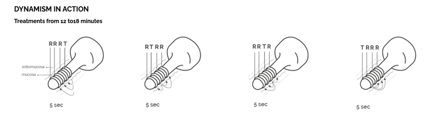 A ponta ergonômica especial é usada para tratar as áreas mais internas. Graças aos emissores/receptores em forma de anel capazes de fornecer um aquecimento total dos tecidos, garante um tratamento indolor e verdadeiramente agradável para o paciente.