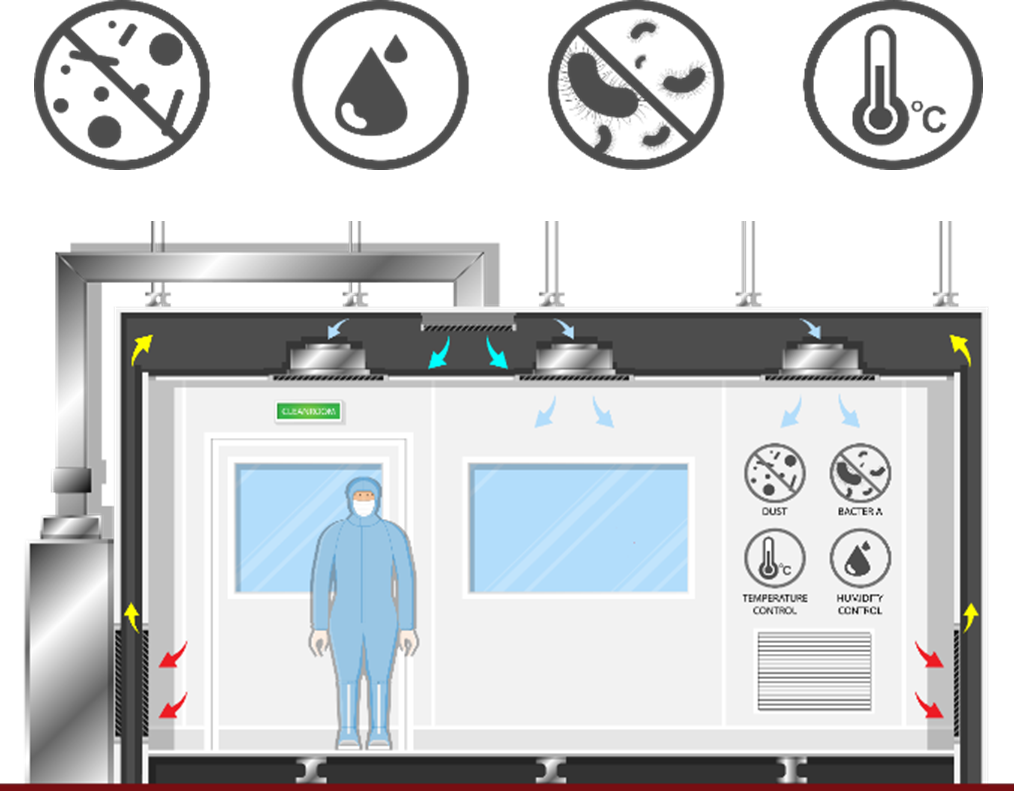 - o ar, previamente filtrado, é bombeado para a sala pelo teto, e é aspirado através de grades no chão; em seguida, o ar passa pelos filtros e reinicia o ciclo.